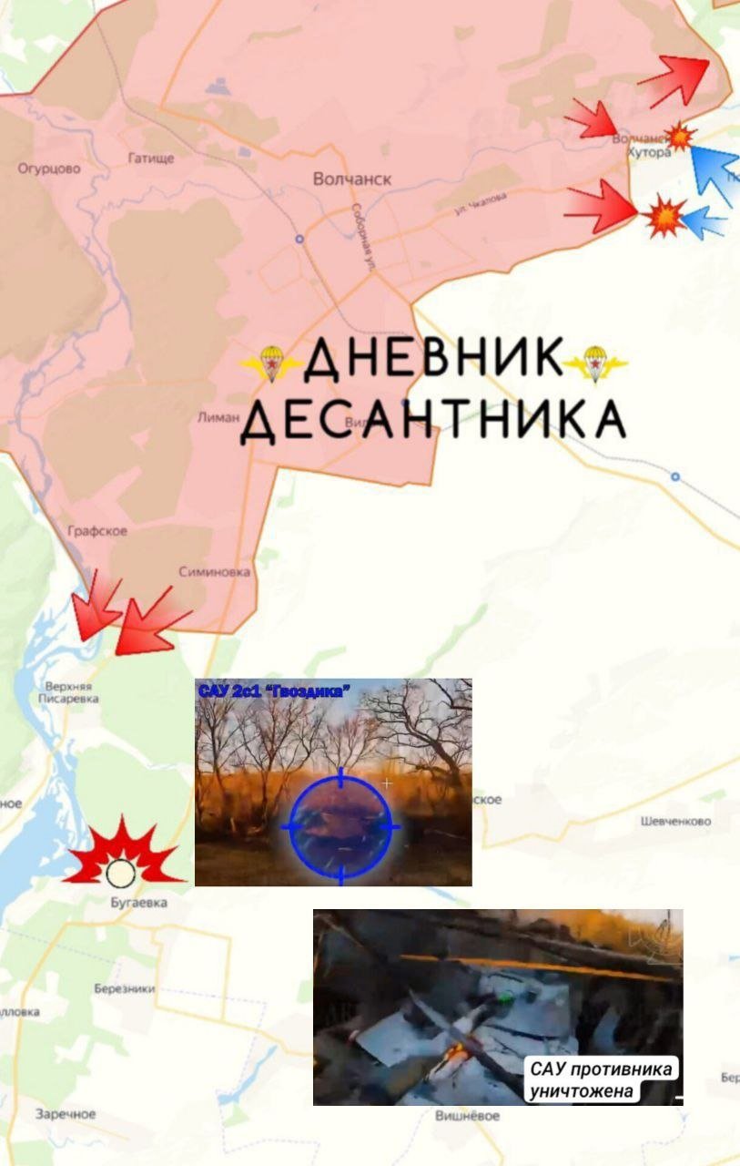 FPV-дроны и артиллерия активно поддерживают наступление, уничтожая технику и огневые позиции противника. Под Бугаевкой поражена украинская САУ "Гвоздика", под Колодезным сбит БТР М113. Также ликвидированы позиции миномётчиков и радиолокационная станция ПВО.