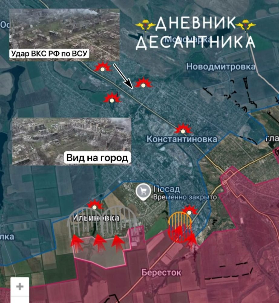 Также расширена зона контроля и восточнее Берестка, само село освобождено от ВСУ. В промзоне западной части Константиновки наши войска наносят удары дронами по выявленным позициям ВСУ. Идут бои на западных границах города. Если у Вас есть дополнения по обстановке, Вы хотите, чтобы мы сообщили об успехах Вашего подразделения, - пишите нам в бот обратной связи, сообщает Telegram-канал