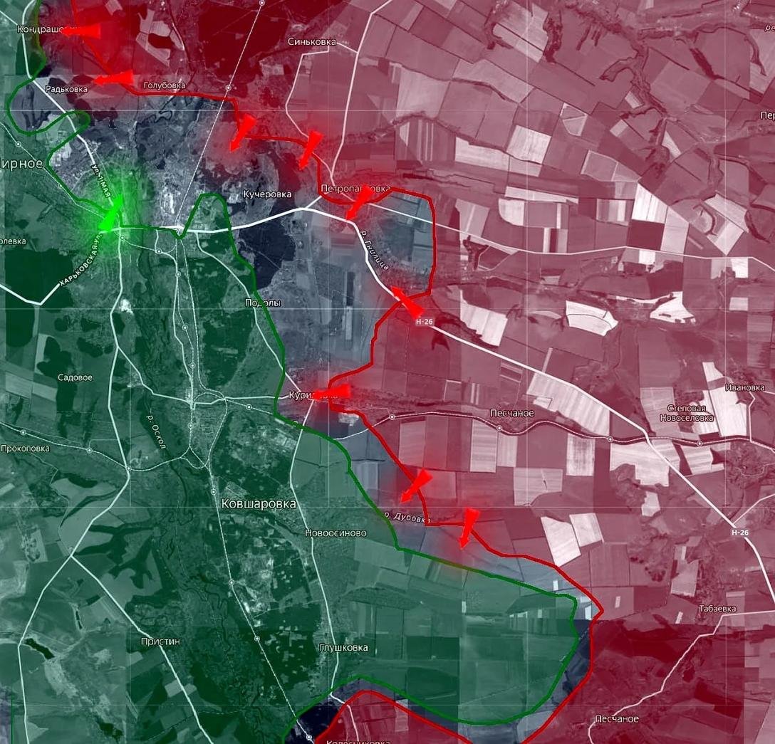 Согласно сообщениям пабликов военной тематики, подтверждаются локальные продвижения российских войск в районе Петропавловки и Песчаного на левом берегу реки Оскол. Со стороны Петропавловки российские войска укрепили позиции по руслу реки Гнилица. При этом в южной части населенного пункта по-прежнему сохраняется присутствие противника. Продвижение ВС РФ в районе Петропавловки подтверждает контролируемый ГУР Минобороны Украины паблик Deep State.