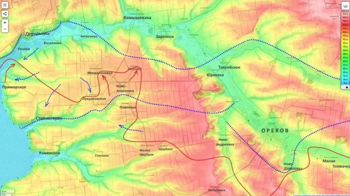 На Ореховском участке ВСУ используют плацдарм южнее реки Конка для давления на российские позиции. Противник пытается выдавить ВС РФ из Приморского и цепляется за северные окраины Степногорска. Идут атаки с целью срезать тактический выступ, образованный зимой, в районе Лукьяновского, Новояковлевки и Павловки. Ситуация здесь оценивается как сложная.