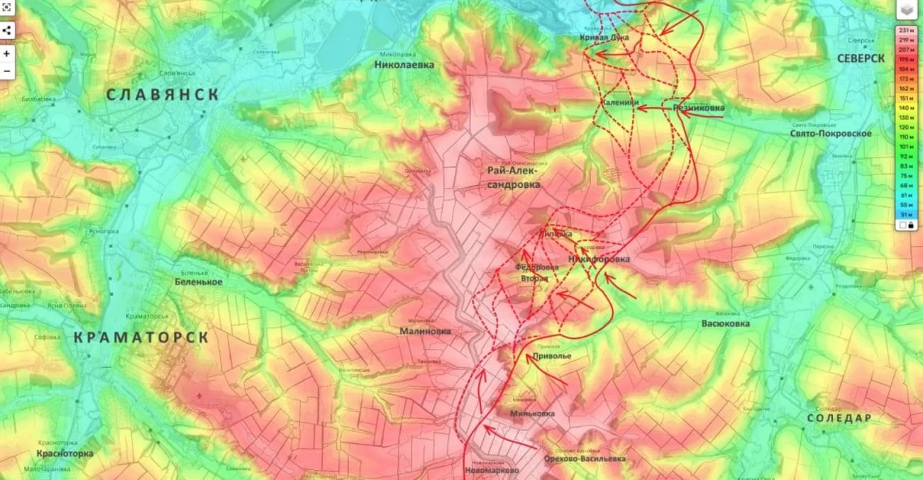 Одновременно российские части совершают обходной маневр, окружая Константиновку и отрезая ее от логистических коммуникаций с соседними населенными пунктами. Трасса снабжения через Алексеево-Дружковку уже находится под плотным огневым контролем ВС России, что делает практически невозможным эвакуацию раненых и доставку боеприпасов и продовольствия в город.