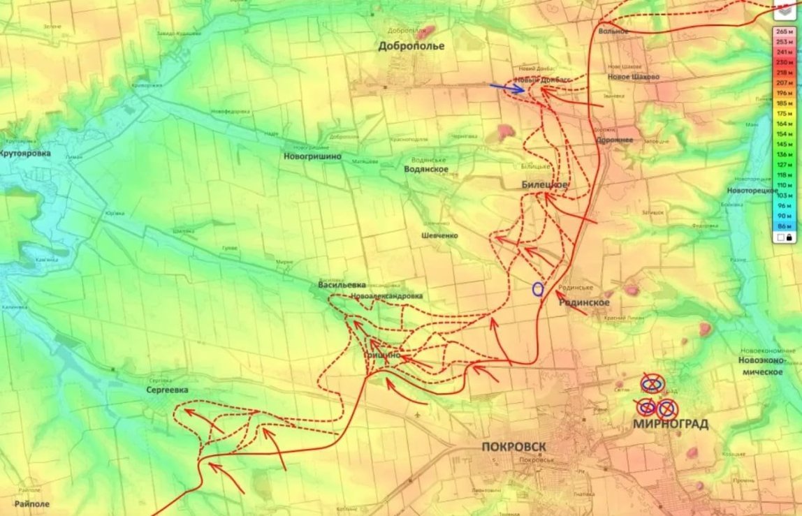 Присутствие наших войск фиксируется у Новоалександровки и Василевки. Непрерывные бои идут к северо-западу от Родинского, а также в Белицком и Новом Донбассе.