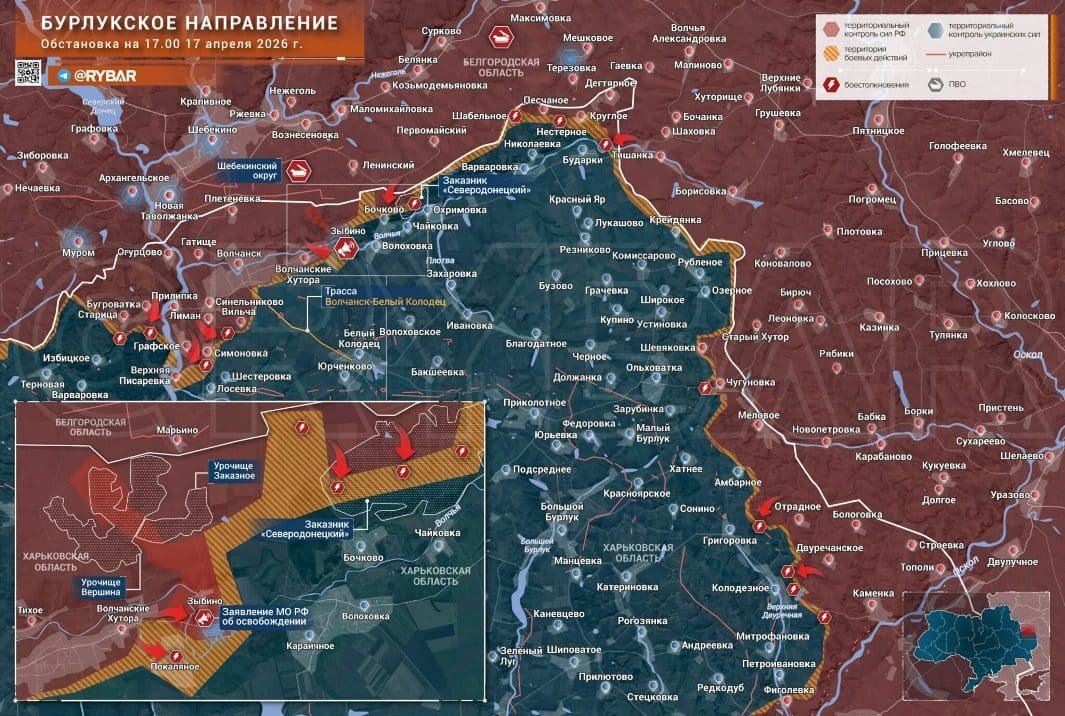 На Бурлукском направлении подразделения группировки "Север" продолжают постепенно продвигаться в приграничных районах Харьковской области. В окрестностях Волчанска сохраняется высокая интенсивность боёв: основные столкновения разворачиваются в лесных массивах у Симоновки и Верхней Писаревки, где стороны ведут манёвренные действия малыми группами.