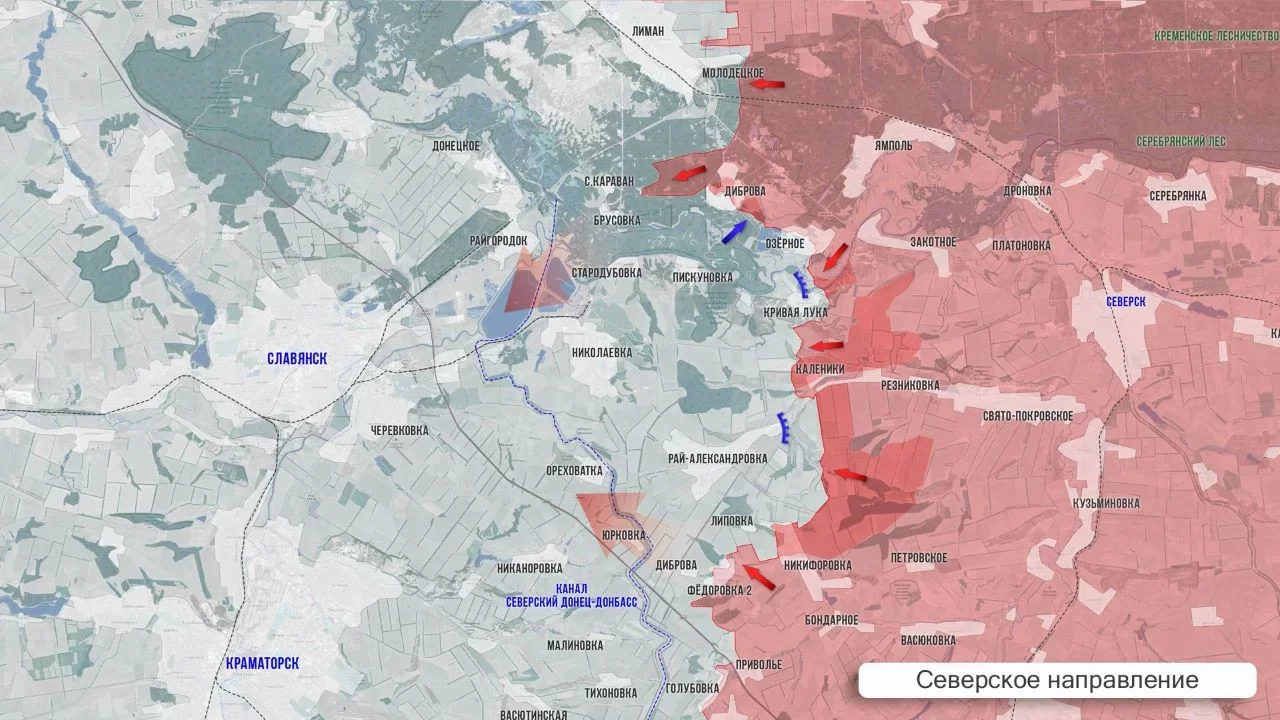 С севера наступление развивается со стороны Дибровы в направлении канала Северский Донец - Донбасс. В районе Старый Караван - Брусовка сохраняется серая зона.