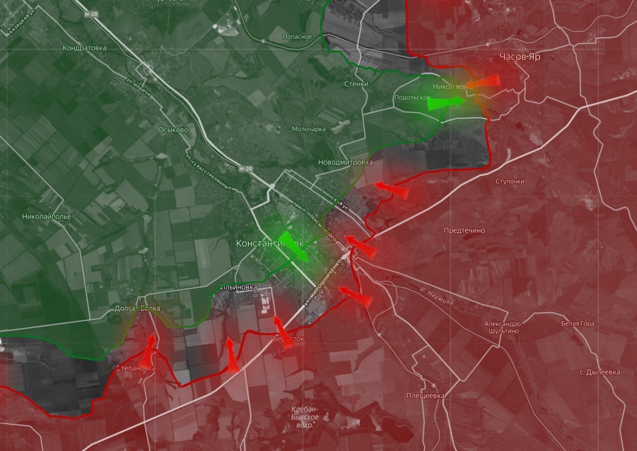 В Константиновке российские войска сражаются в центре города у железнодорожного вокзала, а также зашли в районы "Железнодорожный" и "Шанхай". Идут бои в промзоне города, у цинкового завода, корпуса которого противник превратил в узлы обороны. По юго-западной части Константиновки наносятся удары фугасными авиабомбами ФАБ-3000.