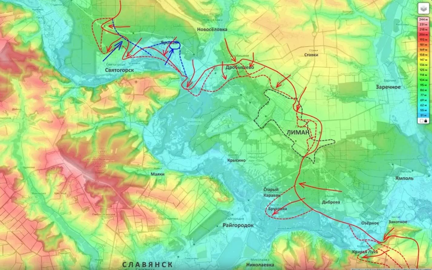 Аналогичная тактика применяется западнее Лимана и в районе Дробышево. Успешное продвижение здесь грозит местной группировке ВСУ оперативным окружением, а в перспективе - открывает дорогу для охвата Славянска.