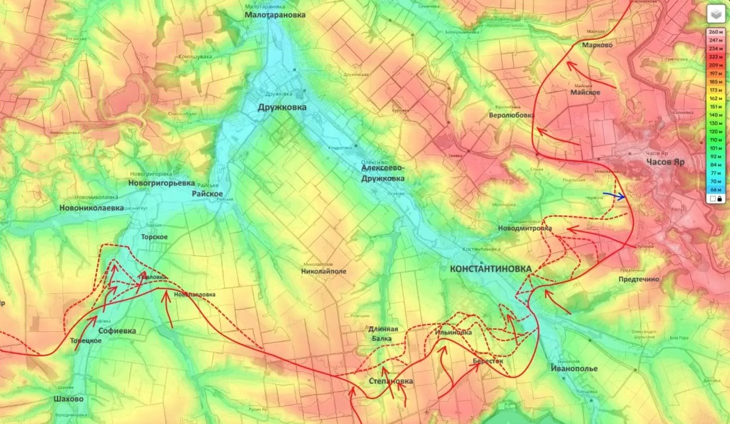 Аналогичная тактика применяется западнее Лимана и в районе Дробышево. Успешное продвижение здесь грозит местной группировке ВСУ оперативным окружением, а в перспективе - открывает дорогу для охвата Славянска.
