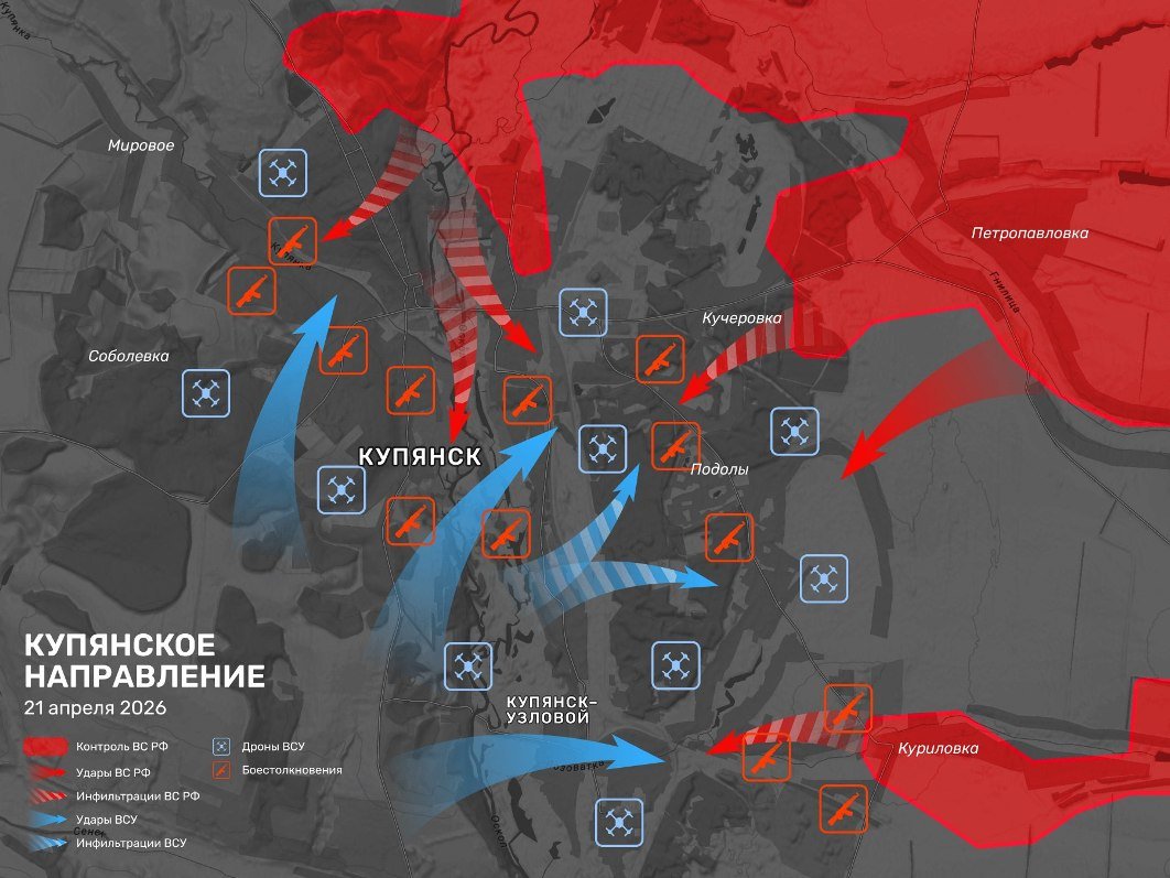 Вооружённые силы Российской Федерации (ВС РФ) постепенно восстанавливают контроль над теми позициями, которые были утрачены в ходе недавних манёвров украинских войск на Купянском направлении. При этом боевые действия здесь носят ожесточённый характер и ведутся как на подступах к Купянску, так и в самом городе. В материале от 22.04.2026 N4k собрал свежие данные о ситуации, складывающейся на Купянском фронте.
