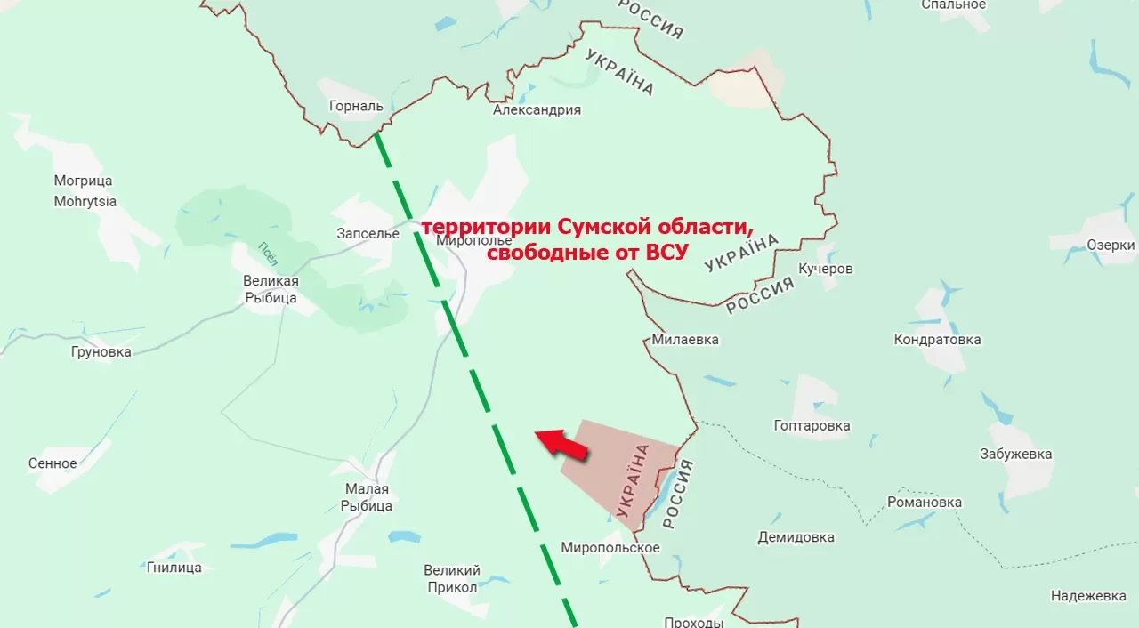 Вооружённые силы России продолжают наступательные действия в Сумской области. К середине сегодняшнего дня ВС РФ перевели под свой контроль очередной участок приграничья в восточной части указанного региона. Площадь участка составила порядка 7 квадратных километров. Это приграничная "трапеция" к северу от ранее освобождённого нашими войсками села Миропольское.