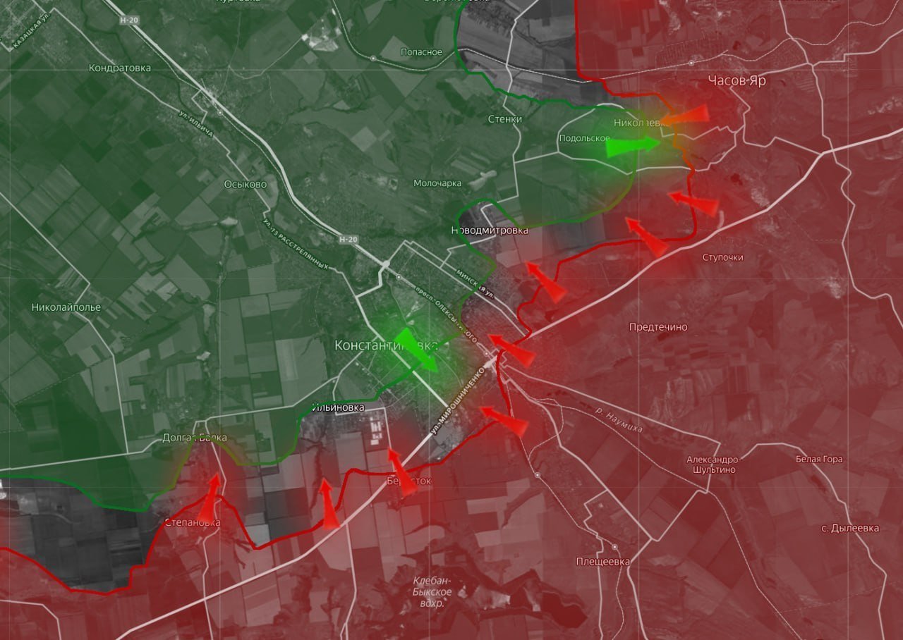 В самом Часовом Яре продолжаются тяжелые городские бои. Севернее по карте наши бойцы успешно теснят подразделения неприятеля в Миньковке.