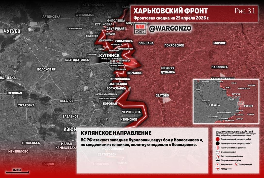 Усиленное наступление российских войск продолжается на Купянском направлении. Бойцам армии РФ удаётся улучшать свои позиции и вместе с этим не позволять противнику захватывать новые районы на подступах к Купянску. Редакция N4k собрала самую актуальную и проверенную информацию о ситуации на линии боевого соприкосновения к 25 апреля 2026 года.