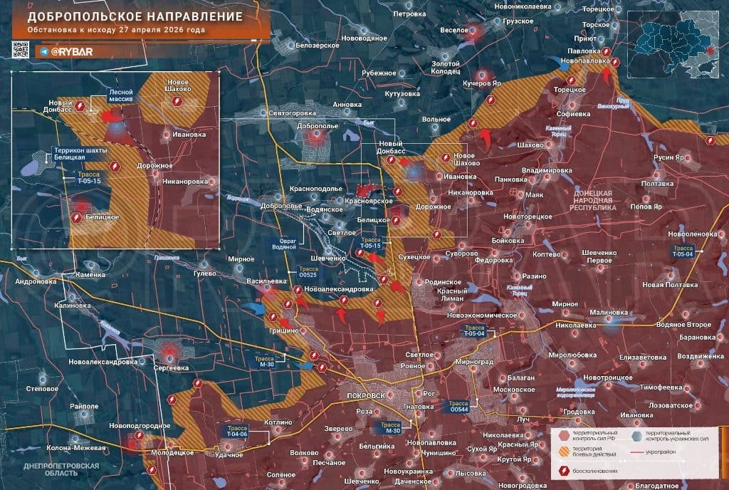 На Добропольском участке боевые действия идут на прежних рубежах: севернее Гришино и в районе Белицкого, где продолжается зачистка города. Украинские силы пытаются восстановить контроль над утраченными позициями в районах Гришино и сдержать продвижение противника в сторону Мирного, Сергеевки и Межевой.