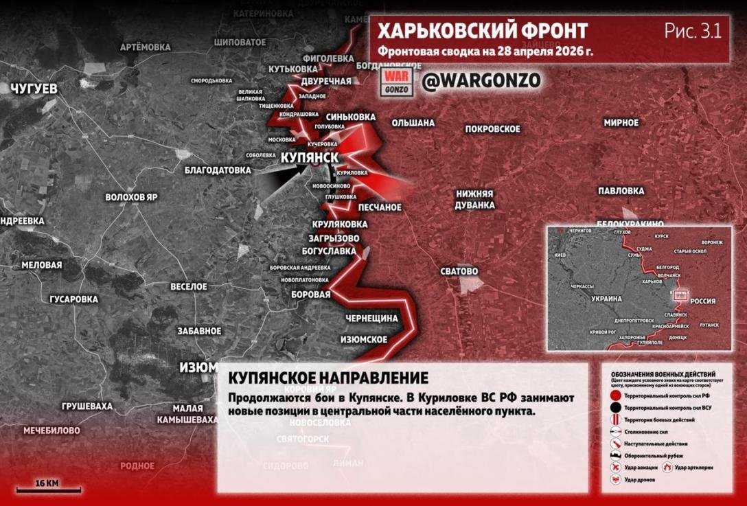 В конце апреля 2026 года боевые действия на Купянском направлении носят ожесточённый характер. Внутри Купянска не смолкают встречные сражения, а в целом инициатива на данном участке фронта - за бойцам Вооружённых сил Российской Федерации (ВС РФ). Новые подробности - в материале N4k от 28.04.2026.