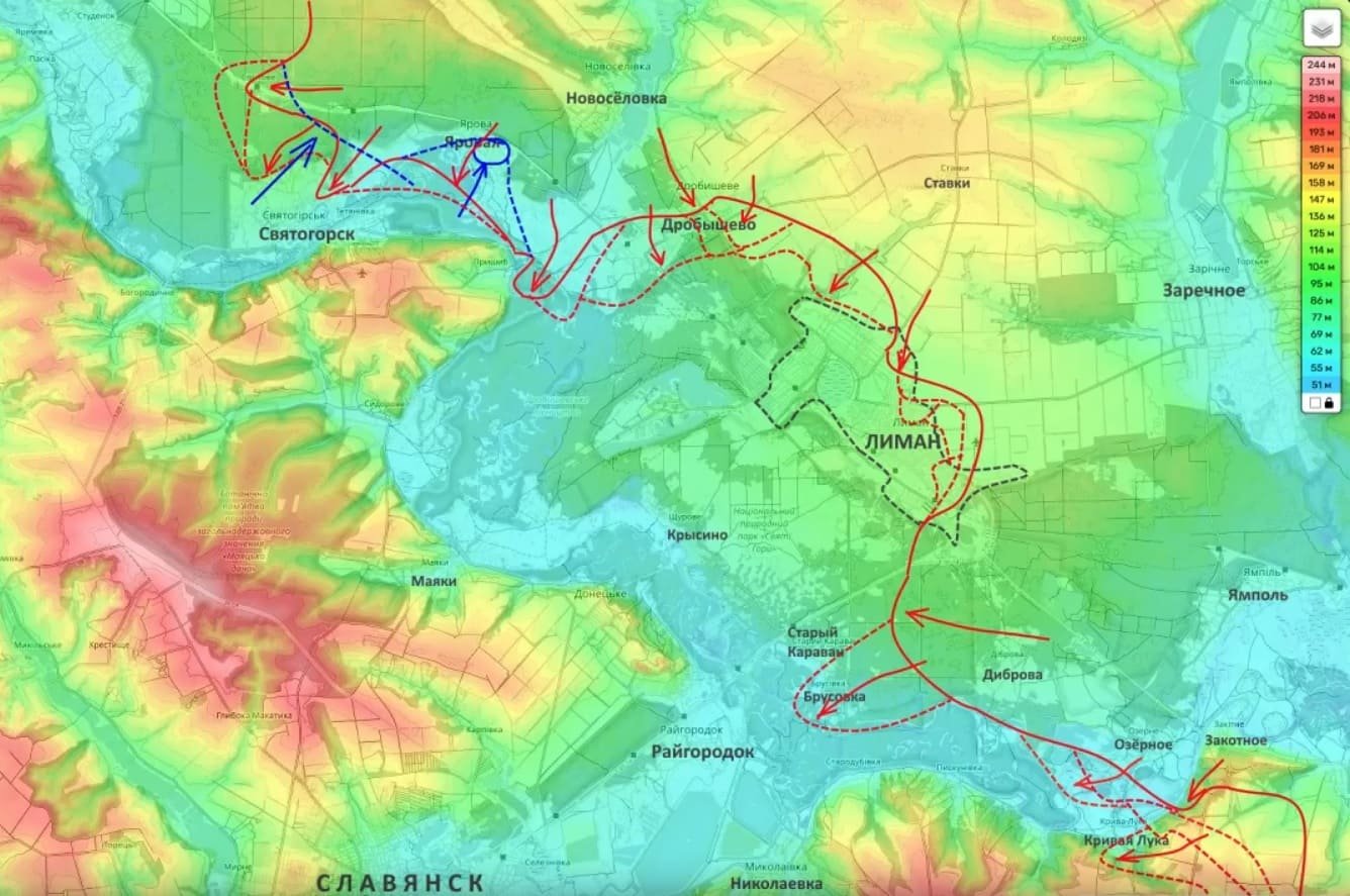 В свою очередь на Лиманском направлении подразделения Вооружённых сил Российской Федерации заняли населённый пункт Озёрное. Таким образом здесь продолжается обход Лимана с юга.