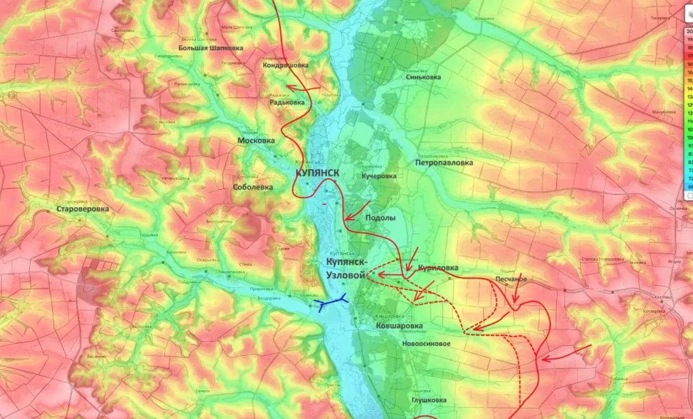 "Подразделения, которые там остались, испытывают огромную нужду в снабжении и это позволяет нам двигаться вперёд. Отмечены бои на восточных окраинах Купянска-Узлового и также мы постоянно заходим в Ковшаровку. Это важнейший посёлок городского типа, заходы в которой становятся практически ежедневными и основные бои за Ковшаровку не за горами", - отметил Подоляка.