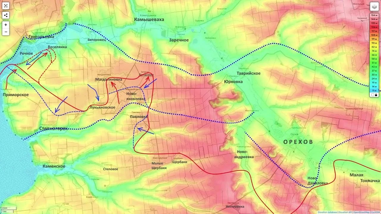 В свою очередь в зоне ответственности группировки "Днепр" продолжаются ожесточённые встречные бои. Противник, задействуя оставшиеся на этом участке штурмовые резервы, пытается контратаковать в районе Степногорска и Приморского. Существенных изменений линии фронта здесь пока не зафиксировано.