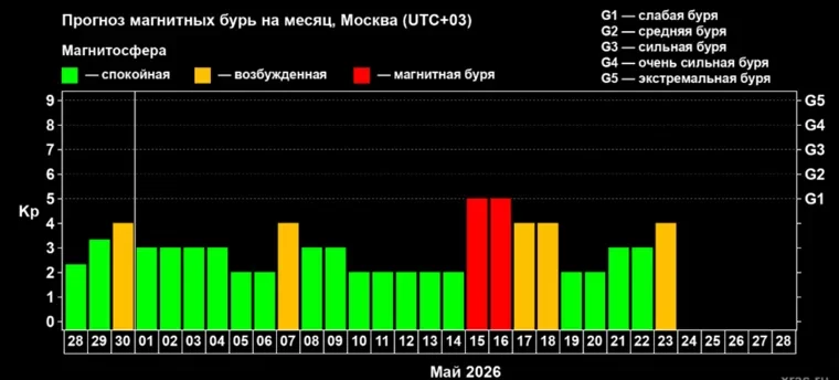Согласно данным Лаборатории солнечной астрономии ИКИ и ИСЗФ РАН, май 2026 года ожидается неспокойным. В первой половине месяца на Земле прогнозируется одна магнитная буря. Вторая половина мая окажется более напряжённой: магнитосфера часто будет находиться в возбужденном состоянии, а в отдельные дни приблизится к "красному" уровню, при котором оказывается негативное влияние на самочувствие метеозависимых людей, а также на работу электротехники.