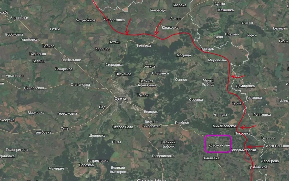 Теперь бои за местную Новодмитровку (Сумская область) идут с трёх направлений - юга, востока и севера. Следующей целью станет Краснополье. Потеря Краснополья станет для ВСУ катастрофой регионального масштаба, так как это создаст идеальный плацдарм для охвата города Сумы с южного направления.